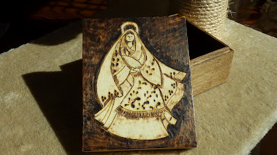Em madeira decorada com técnica de pirogravura